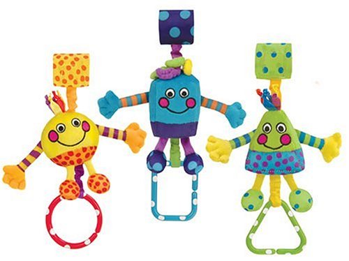- shapes can be individually attached to infant carrier/stroller- Each shape makes either a rattle, chime, or squeeker sound
